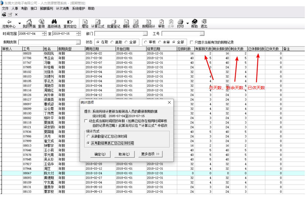 在同鑫HR系統(tǒng)的“假期管控”中,只需輕輕一點(diǎn)“假期統(tǒng)計(jì)”按鈕就可統(tǒng)計(jì)出員工的年休假了。其中,年假的統(tǒng)計(jì)開始日期和結(jié)束日期都是可以調(diào)整的,系統(tǒng)會自動計(jì)算出該期間所有員工的總年假天數(shù)、已休天數(shù)、剩余天數(shù)。實(shí)時(shí)管控員工年假已休天數(shù)、剩余天數(shù),當(dāng)員工剩余年假天數(shù)不足時(shí),會彈出提醒框,省心省力。