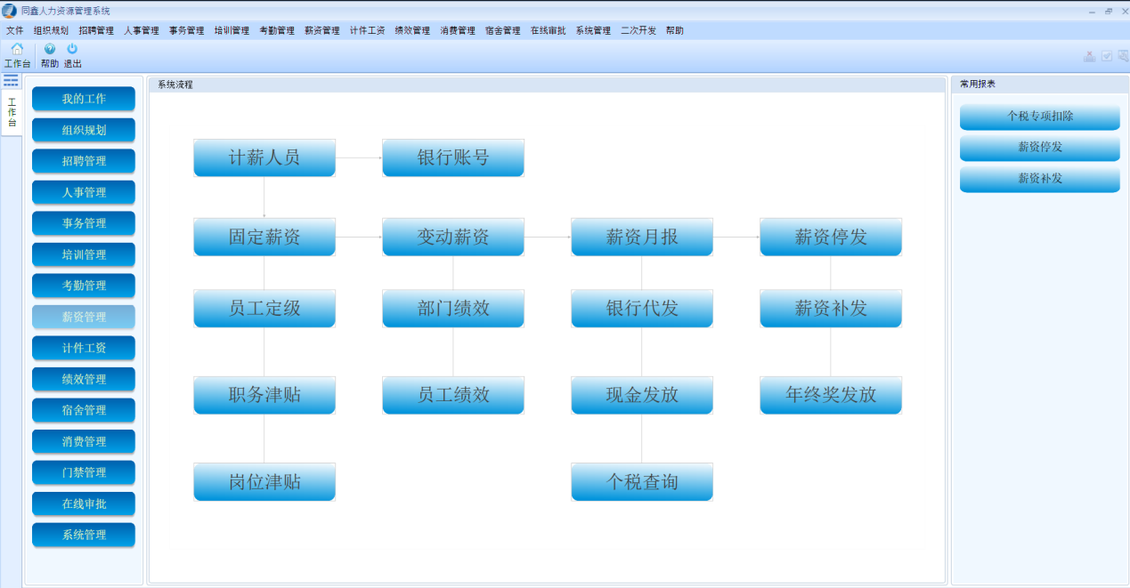 就在最近,國家出臺了個稅改革的相關政策,對于企業員工來說絕對是一個大福利,但是可會累壞了企業的HR部門。因為個稅改革需要重新錄入員工的基本信息,還需要對企業員工的薪資結構還有福利保障等方面做出調整,所以在工資管理還有福利納稅等方面,將會對HR部門做出巨大的挑戰。同鑫HR管理軟件能夠輕松的幫助企業HR們度過這個難關,因為供應商會實時的更新HR人力資源軟件的計算方式,以保障能夠及時的跟上政府改革的要求。除此之外,同鑫HR管理軟件能夠自動的生成企業員工的考核績效,以方便管理者能夠很好的對員工進行調動,并且安排適當的培訓,以滿足不同崗位對于員工的要求,所以,當企業想要轉型的時候,同鑫HR管理軟件能夠起到至關重要的作用。