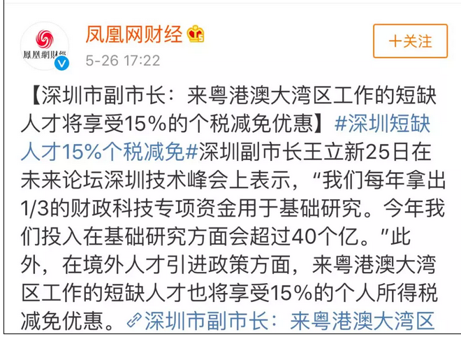 5月25日,深圳副市長又對外放出重磅消息:對短缺人才,給予15%的個人所得稅減免優惠。